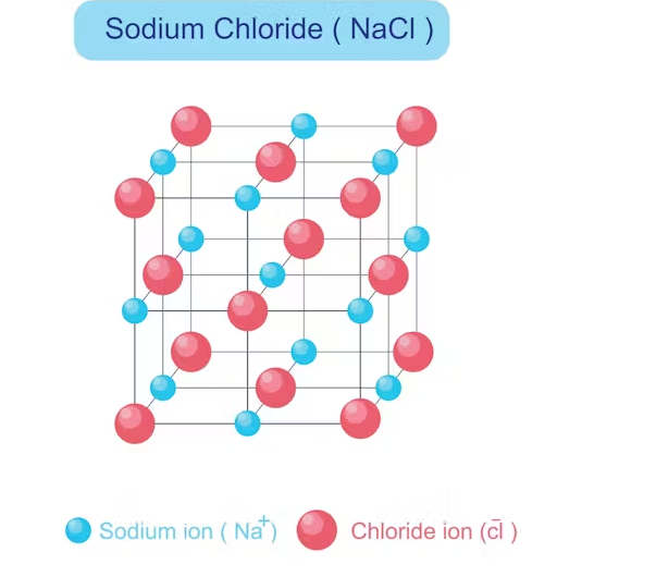 Ces éléments chargés sont disposés dans les cristaux de sel selon un motif régulier et répétitif. Chaque ion sodium est entouré de six ions chlorure et chaque ion chlorure est entouré de six ions sodium. Cette disposition confère au cristal une forme cubique. En observant attentivement le sel, on peut apercevoir des cristaux cubiques.
